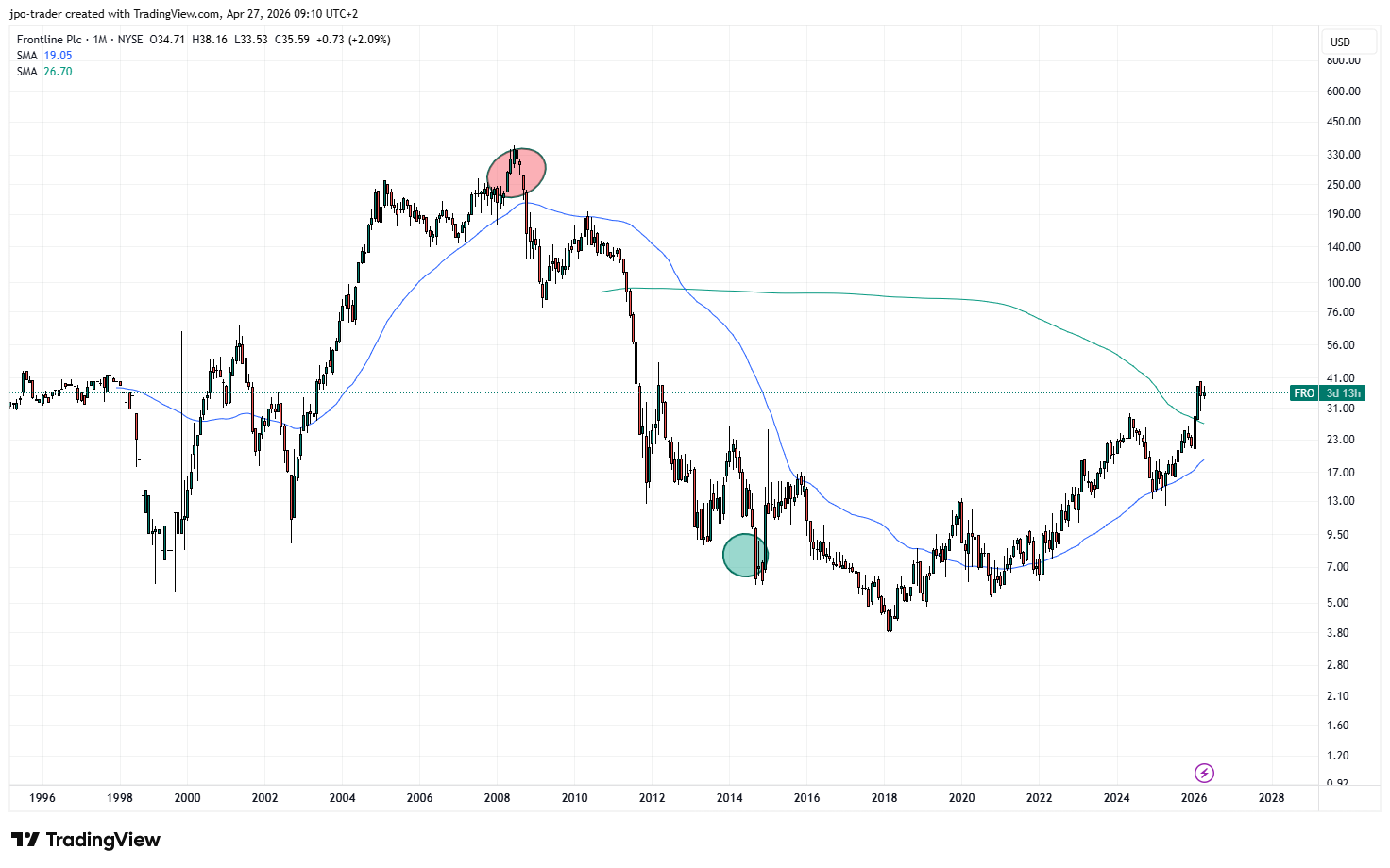 Im folgenden Chart sehen wir eine bekannte Schiffsaktie. Der Branchenfonds mit dem Ticker SHIP wurde 2008 (roter Kreis) aufgelegt und 2014 (grüner Kreis) wieder eingestellt.