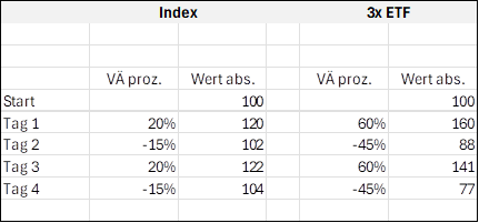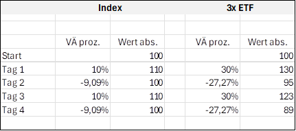 Das Problem liegt im täglichen Reset beziehungsweise in der täglichen Neugewichtung sowie in der kumulierten Volatilität. Klingt zunächst kompliziert, deshalb mache ich es am besten an einem einfachen Beispiel deutlich.