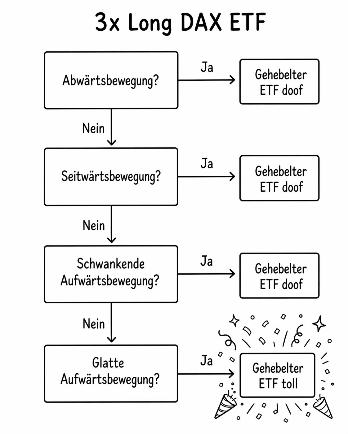 Auf den ersten Blick könnte man meinen, wenn ich einen 3x Long-DAX-ETF kaufe und bullish für den DAX bin, dass ich -falls meine Annahme eintrifft- dann auch dreifach verdiene. Leider ist das nicht zwingend so richtig.