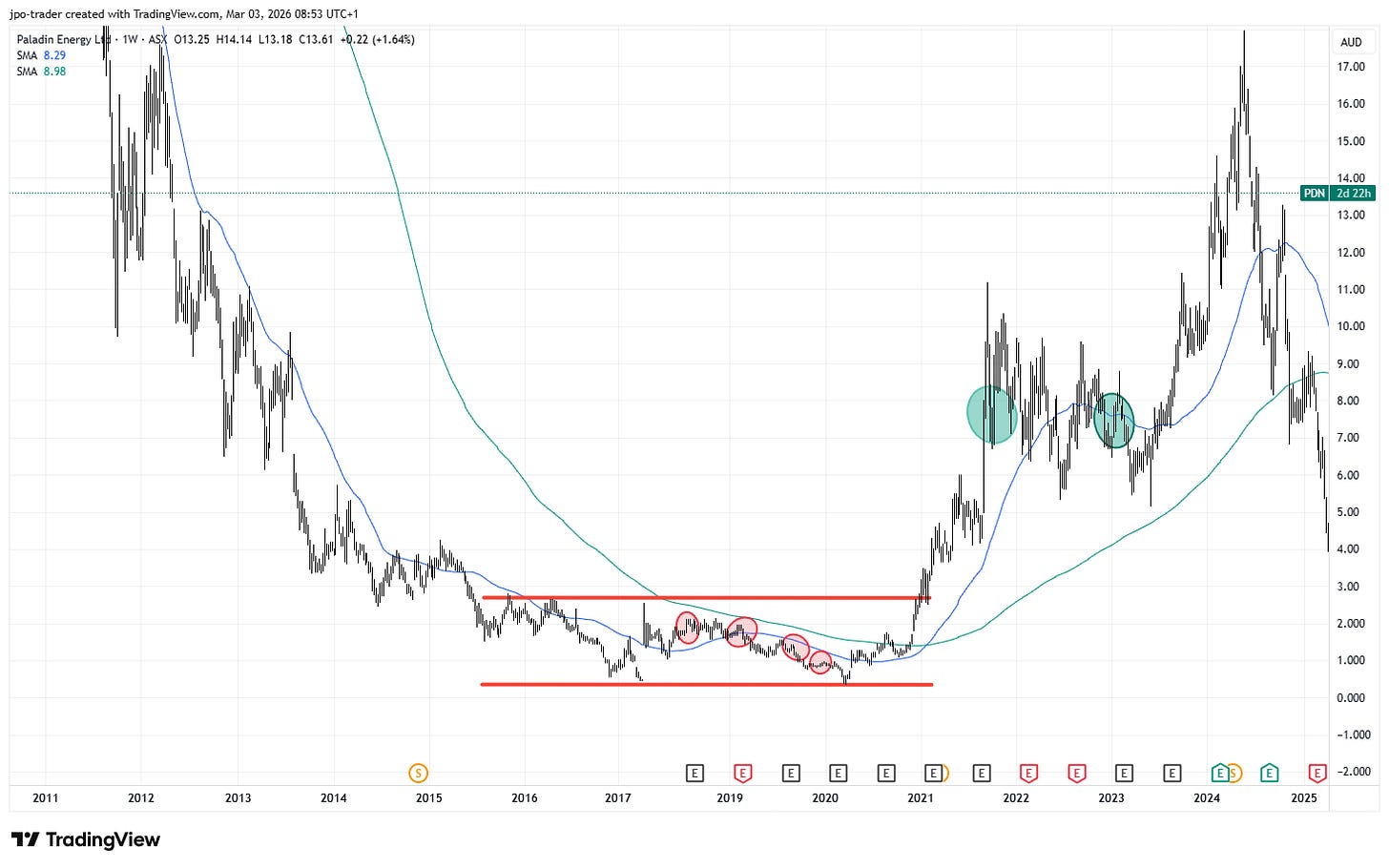 Paladin Energy Ltd ist eine Uran-Minen-Aktie. Ich habe mir über die Jahre tiefes Wissen über diesen Sektor erarbeitet. Außerdem spielt(e) bei Rohstoffen oft ein klassischer Zyklus („Schweinezyklus“) eine Rolle. Ohne hier in die Details zu gehen: Unten sieht man in den roten Kreisen meine Käufe und in Grün meine Verkäufe.
