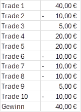Wenn ich bei fünf von zehn Trades jeweils 10 € verliere (Stopp-Loss) und bei den anderen fünf Gewinne zwischen 0 und „unendlich“ erziele, werde ich sehr wahrscheinlich trotz nur 50 % Trefferquote Geld verdienen – weil die Verlustseite begrenzt ist und die Gewinnseite offen. Bildlich dargestellt könnte eine Gewinnverteilung wie folgt aussehen: