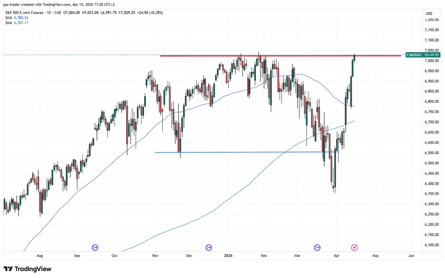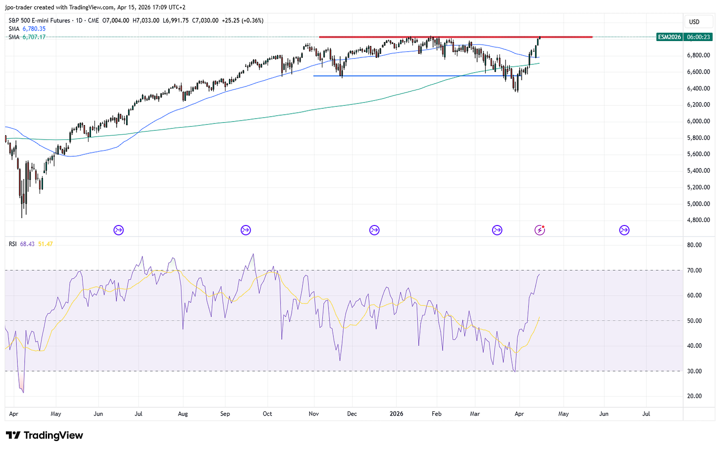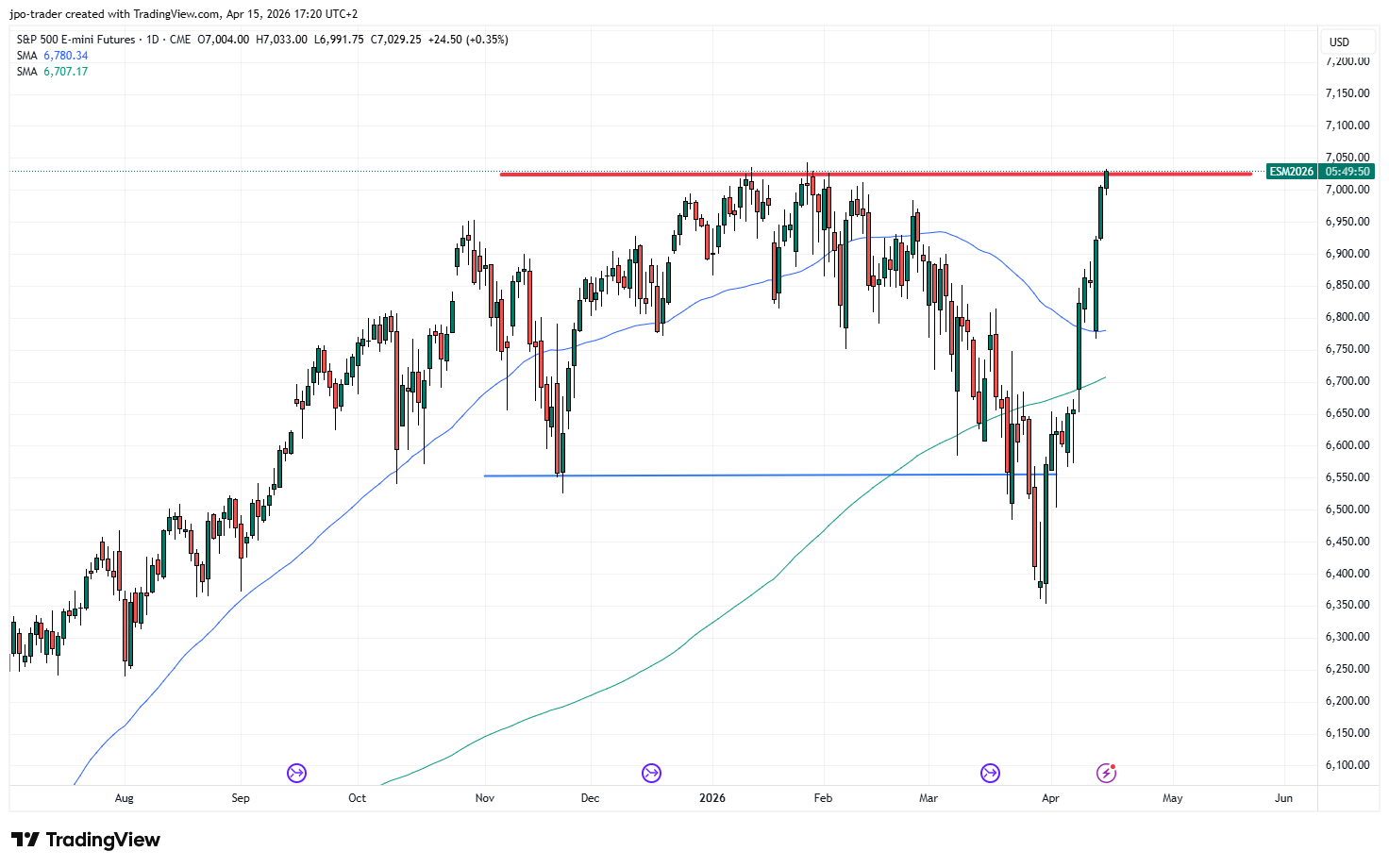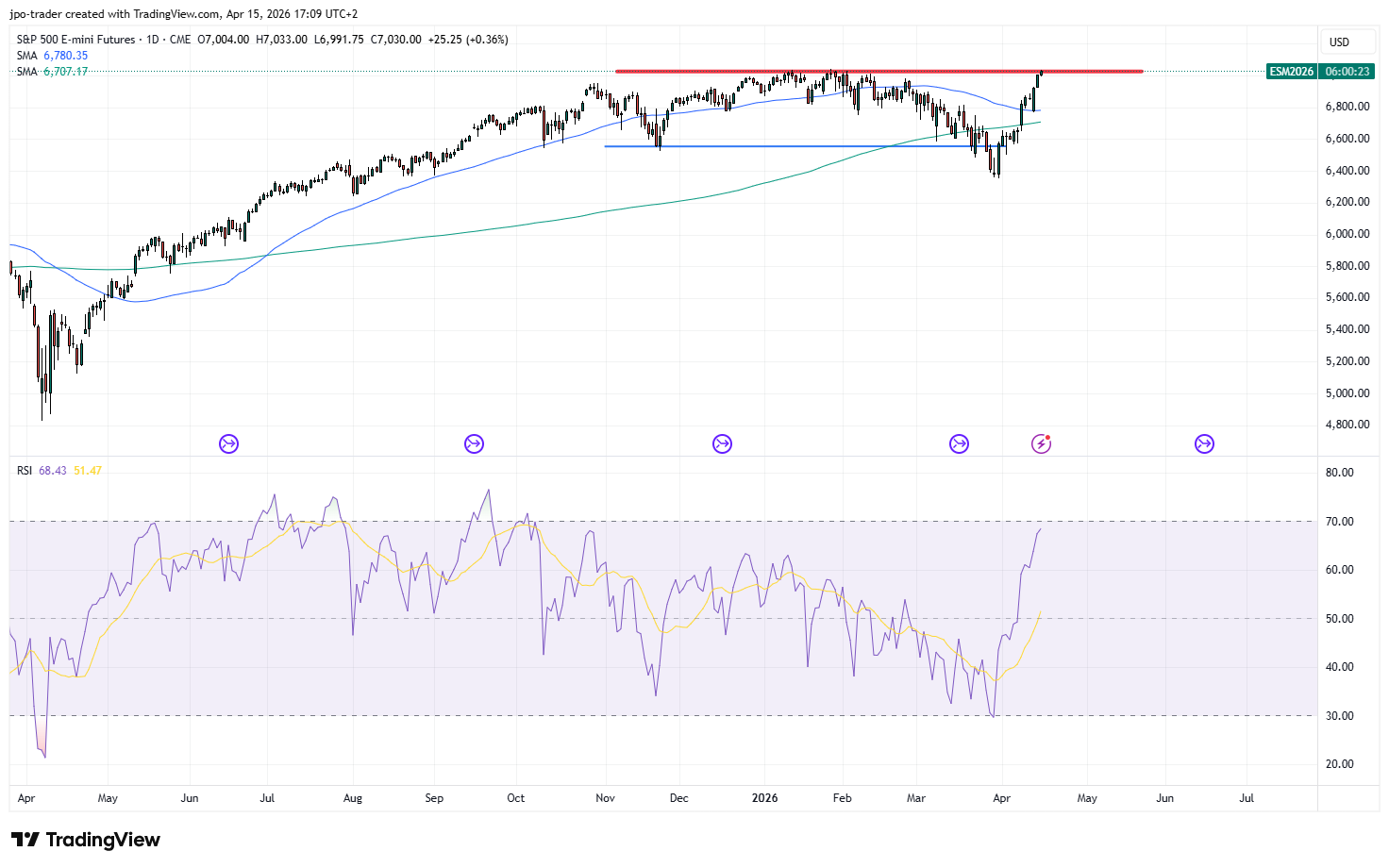 In der oben gezeigten Abb. 3 kann man die 200-Tage-Linie (grün) und die 50-Tage-Linie erkennen. Ein Durchbrechen dieser Linien wird von Tradern – ähnlich wie das bereits im vorigen Artikel vorgestellte Durchbrechen horizontaler Linien – beachtet. So könnten Trader beispielsweise das Durchbrechen der blauen 50-Tage-Linie beim S&P 500 vor wenigen Tagen aus eben zitierter Abb. 3 bei 6.786 getradet haben und einen Stop-Loss kurz darunter gesetzt haben, falls sich der Durchbruch als Fehlsignal herausgestellt hätte.