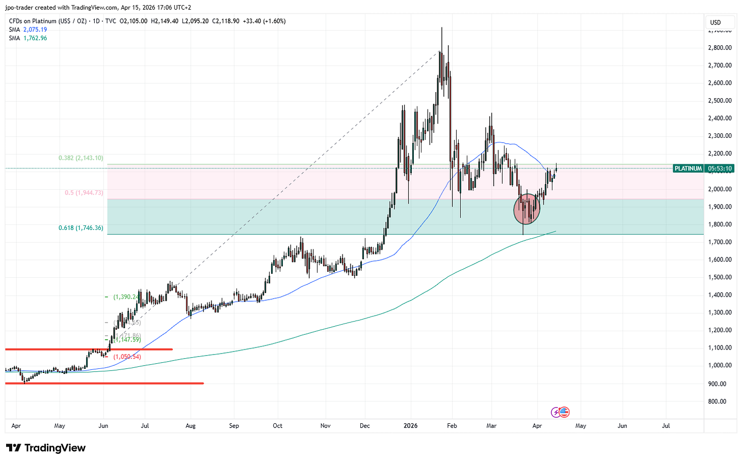 Ein Trader würde im obigen Beispiel (Abb. 6) im Bereich des roten Kreises in Platin einsteigen und seinen Stop-Loss bei einem Bruch kurz unter die Fibonacci-Zone setzen - also unterhalb der grünen Fläche. In unserem Beispiel also bei ca. 1.750 USD. Interessanterweise verläuft hier auch ungefähr die 200-Tage-Linie, so dass man ein doppeltes Signal hat.